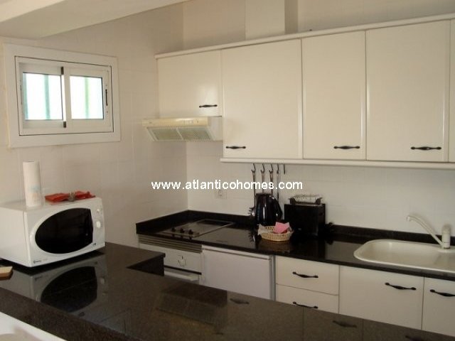 A fantastic top floor one bedroom apartment on a frontline complex with great sea views. The apartment consists of large double bedroom with fitted wardrobes, a bathroom with walk in shower and an open plan lounge/diner with a fully equipped kitchen separated by a breakfast bar. The apartment has air conditioning in the living room and bedroom. The apartment is finished and furnished to the highest standard throughout. The complex is gated with keycode entrance and has a heated pool, CCTV security and Sky satellite system to all apartments with BBC/ITV/RTE etc.