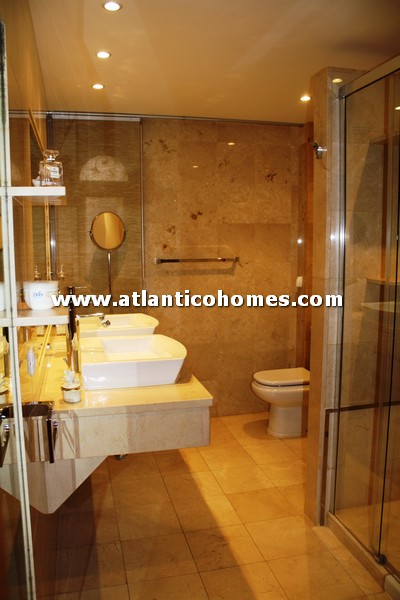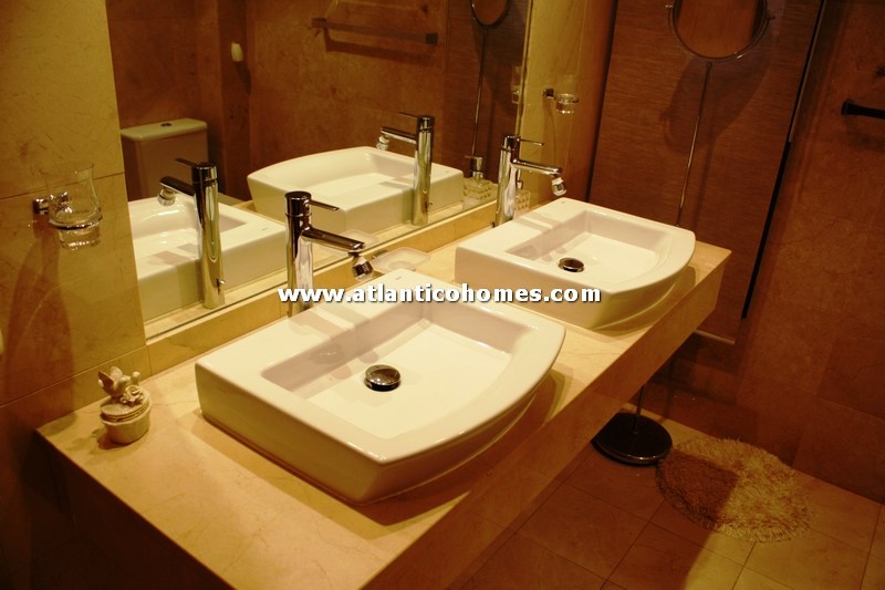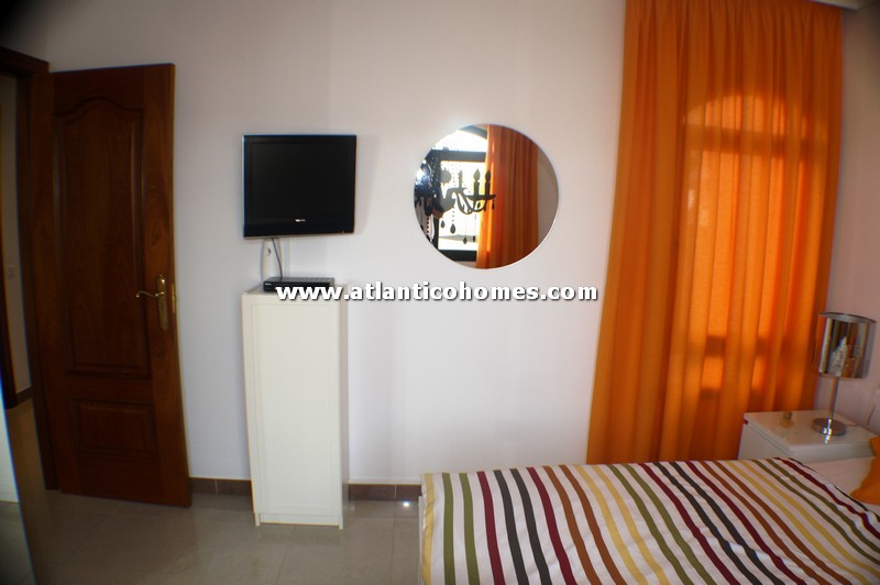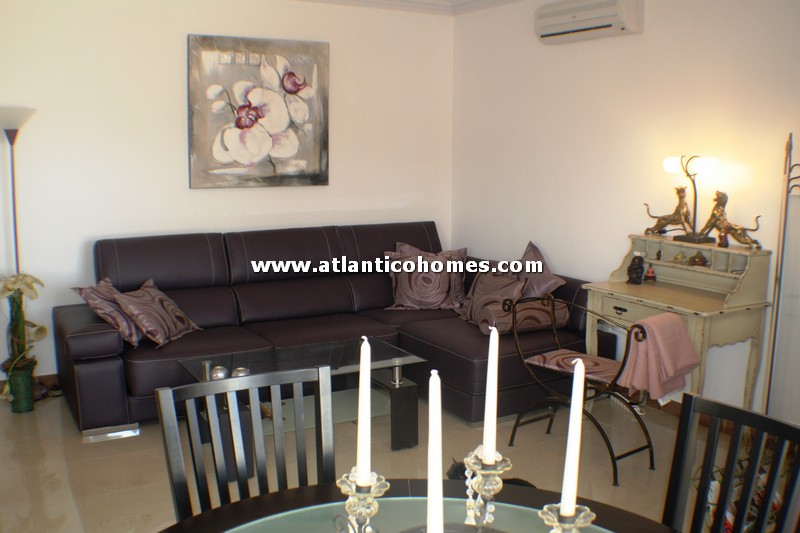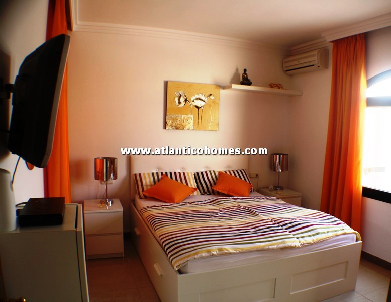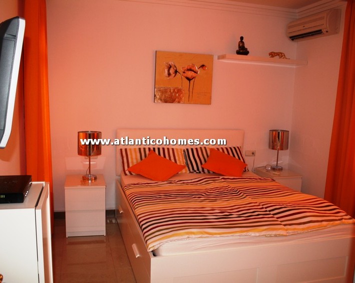 A beautiful ground floor two bedroomed luxury apartment located in a tranquil side street yet still only a stones throw from the main avenida with its beaches and nightlife. The apartment has a modern interior design and consists of a spacious lounge with fully equipped kitchen, 2 double bedrooms and a family bathroom, both bedrooms and the living room have air conditioning fitted. The apartment has a large patio to the front with BBQ area and a very large patio at the rear and has a high wall all around for privacy. The complex has a large heated pool and also a separate children’s pool and terrace area. This apartment has been upgraded to a very high standard with new bathroom, fixtures and fittings throughout.