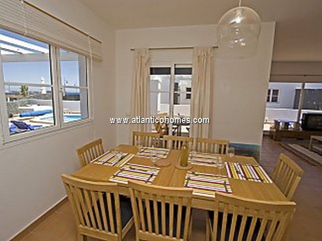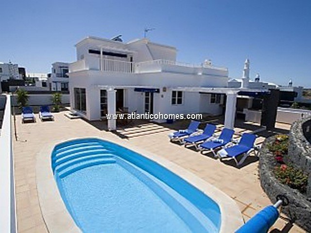 This luxury 6 bed 4 bath villa situated in Los Riscos is one of Playa Blanca’s most prestigious villas. The main house comprises of a fully furnished and equipped kitchen along with a utility room and a spacious living and dining room with French doors opening on the extensive terrace with alfresco dining, large private heated swimming pool and breathtaking panoramic views over Playa Blanca and across the ocean to Fuerteventura. It has 4 bedrooms with air-conditioning and 3 bathrooms. The master bedroom being en-suite with large walk-in shower and Jacuzzi bath. In addition, the villa benefits from a self-contained 2 bed 1 bath apartment which is situated below the main house with independent access. This impressive family home or holiday home has a secure driveway with double garage. Playa Blanca is the most popular tourist destination in the south of the island and offers some pretty sandy beaches, designer shops, seafront bars and excellent restaurants.