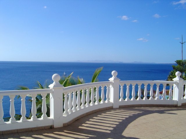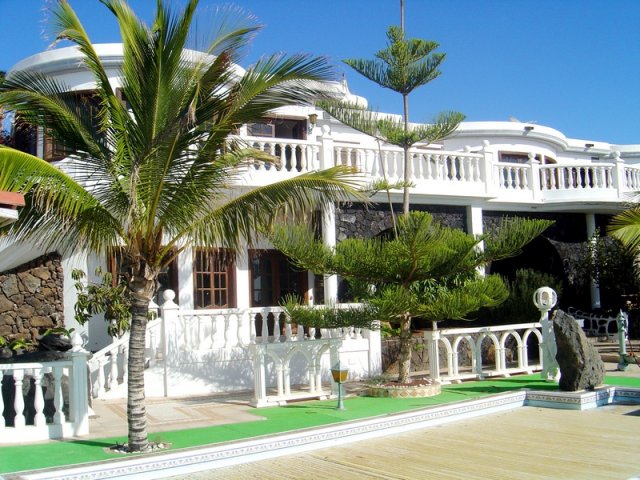 The most truly amazing luxury villa set on the rocks in frontline of the prestigious Riesco Prieto area of Puerto del Carmen. Frontline villas in this location very rarely come to the market. This detached house has panoramic sea views across the Puerto del Carmen harbour and all the way across to the island of Fuerteventura. The main house consists of 5 bedrooms and 4 bathrooms with a large lounge/diner leading out on to one of the many terraces. There is also a completely independent 1 bedroom guest apartment. The property is set in private mature well maintained gardens with a large swimming pool. The villa also offers a large games/entertainment room built with volcanic rock in the Cesar Manrique, Jameos del Agua style. The villa also has lifts taking you down from main house to the swimming pool area and al-fresco dining area. Villa for sale in Lanzarote