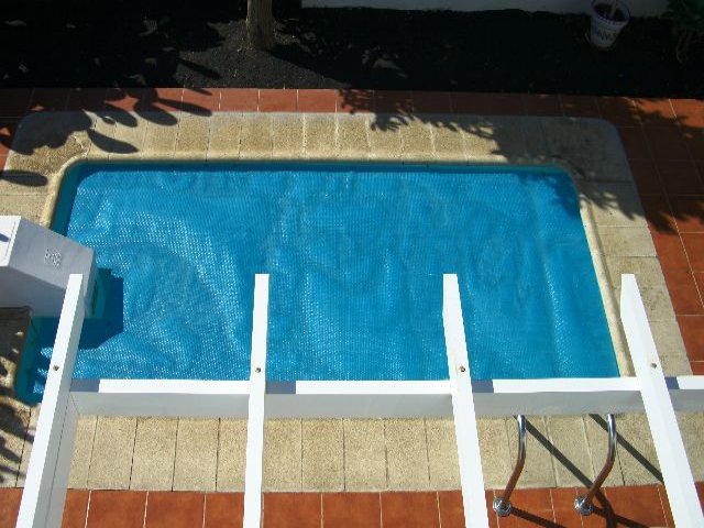 A fantastic semi-detached villas located in a quiet cul-de-sac in the exclusive Los Mojones are of the Old Town of Puerto del Carmen. The property consist of 3 double bedrooms, 2 bathrooms, the master bedroom & bathroom which occupies the top floor has a large private terrace with an almost 360 degree view of the sea and mountains and the golf course. There are two double bedrooms and a family bathroom on the ground floor with a spacious bright living room with separate kitchen and Solana. The lounge leads out via the patio doors to a heated swimming pool and terrace area set in mature gardens. The property comes with a good history of on going holiday lettings.